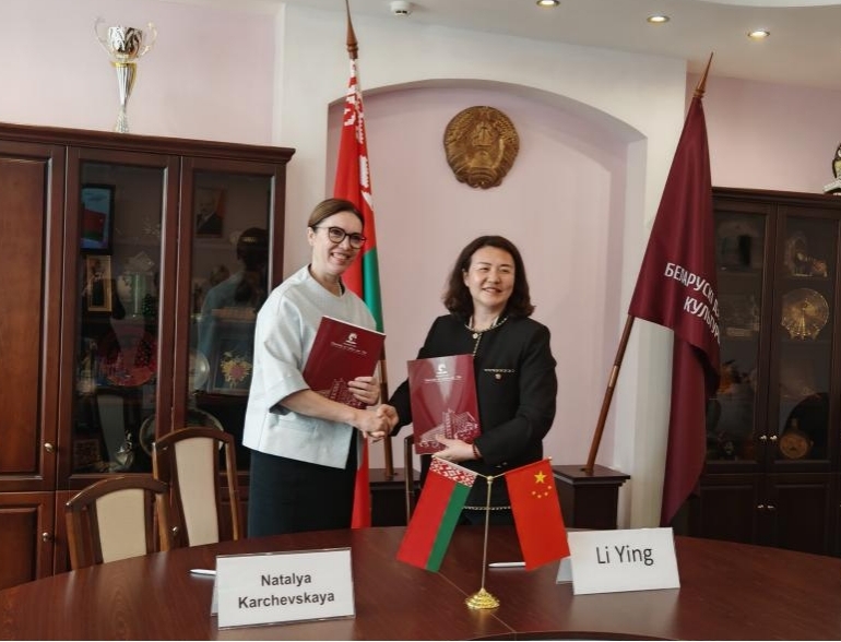 在白俄罗斯国立文化艺术大学,校长娜塔莉娅·卡尔切夫斯卡娅、科研副校长叶莲娜·科尔萨科娃、思政教育副校长尤利娅·佩尔西茨卡娅及国际交流处处长瓦季姆·萨马季亚等校领导出席座谈会。两校正式签署合作协议,该协议的签订将为双方开展合作交流、实施联合项目及深化中白文化纽带开辟新路径。会后参观了该校博物馆、图书馆、文化教育中心及体育文化中心。