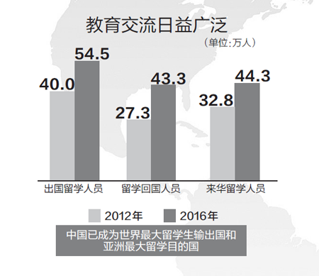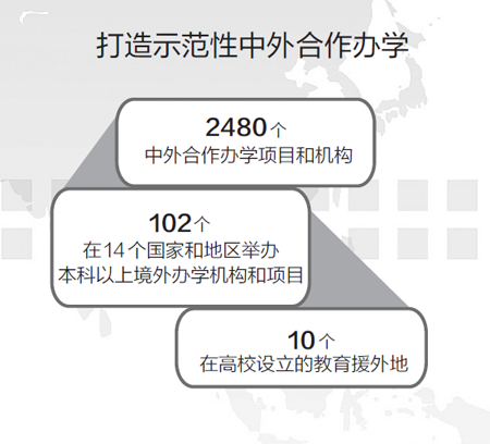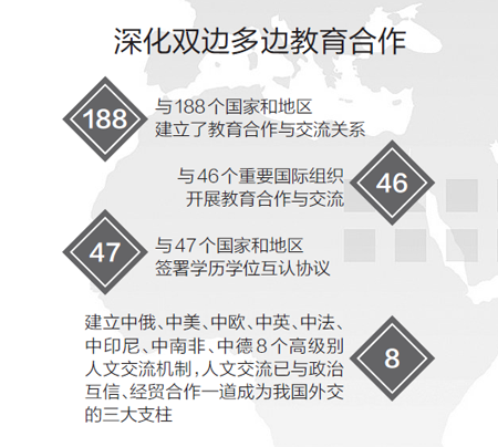 目前,中国已基本形成全方位、多层次、宽领域的教育对外开放格局,在加强顶层设计、推动中外人文交流、培养高层次人才以及引进优质教育资源等方面成就凸显。